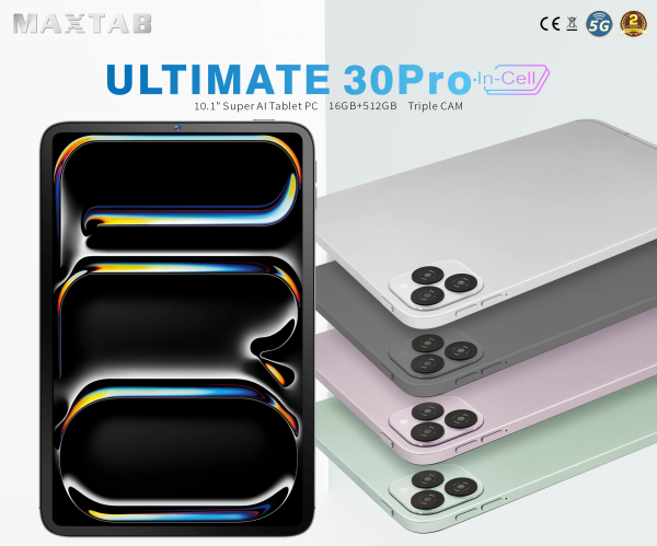 The MAXTAB ULTIMATE 30 Pro in-Cell is an advanced 10.1″ Super AI Tablet PC built for speed and immersion. It features a high-quality 10.1-inch IPS HD Display utilizing in-Cell technology for better image clarity and a thinner profile. The tablet is powered by an efficient Octa-Core SOC and runs on the modern Android 14 operating system. Performance is guaranteed with a generous 16GB of RAM and ample storage provided by 512GB ROM.For capturing moments, the tablet boasts a Triple CAM system, featuring impressive 20.0MP and 30.0MP cameras. A long-lasting 10000mAh battery ensures extended use, supported by 9V/2A (max) charging. Connectivity is comprehensive, offering 5G, Dual SIM support, WiFi, BT, FM, and GPS. The device includes essential physical connections: OTG Type-C, USB, and a 3.5mm Ear Jack. The tablet is also packaged with various free gifts, including a keyboard and screen protector, and is available in multiple appealing colors like Dark Gray, Light Gray, Lavender, and Mint Green.